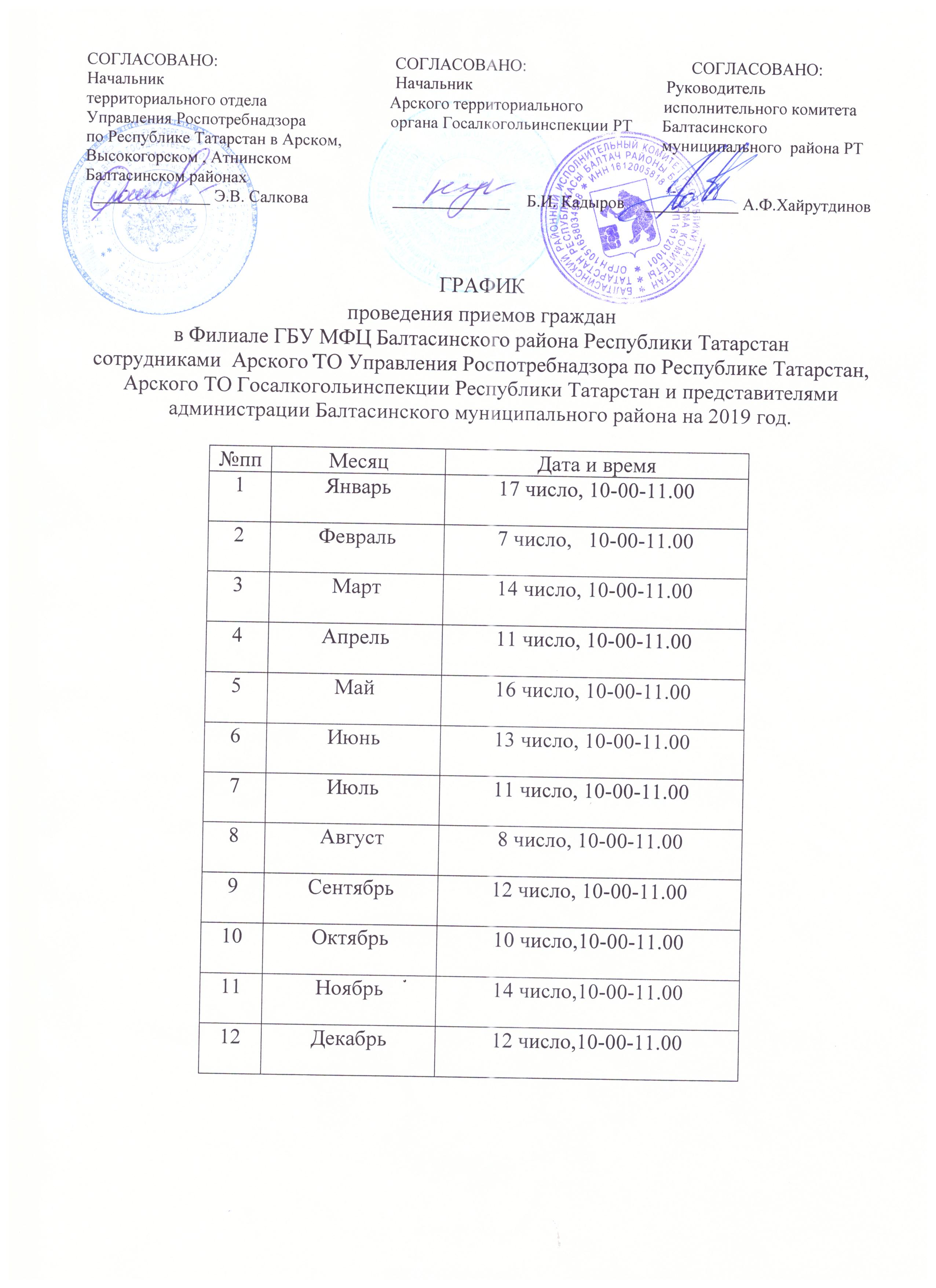 График проведения приемов граждан в Филиале ГБУ МФУ Балтасинского района Республики Татарстан сотрудниками Арского ГО Управления Роспотребнадзора по РТ, Арского ТО Госалкогольинспекции на 2019 г.