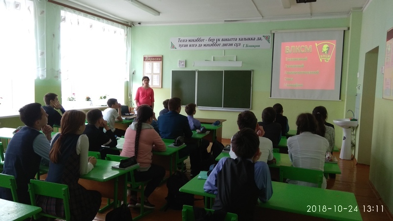 В рамках проведения 100-летия ВЛКСМ 24 октября 2018 года на базе МБОУ «Балтасинская СОШ» социальным педагогом Балтасинского КЦСОН «Наз» Лилией Зариповой было проведено групповое занятие «Комсомол». Задачи занятия: изучение истории общественных организации страны, воспитание активной гражданской позиции подрастающего поколения. С 17 учащимися был организован просмотр презентиции по теме "100 лет Ленинскому комсомолу" с ознакомлением с настоящим комсомольским билетом и значком. Данное мероприятие вызвало большой интерес у подростков.