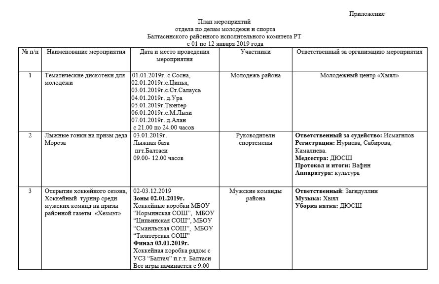 План мероприятий отдела по делам молодежи и спиорта Балтасинского районного исполнительного комитета РТ с 01 по 12 января 2019 года
