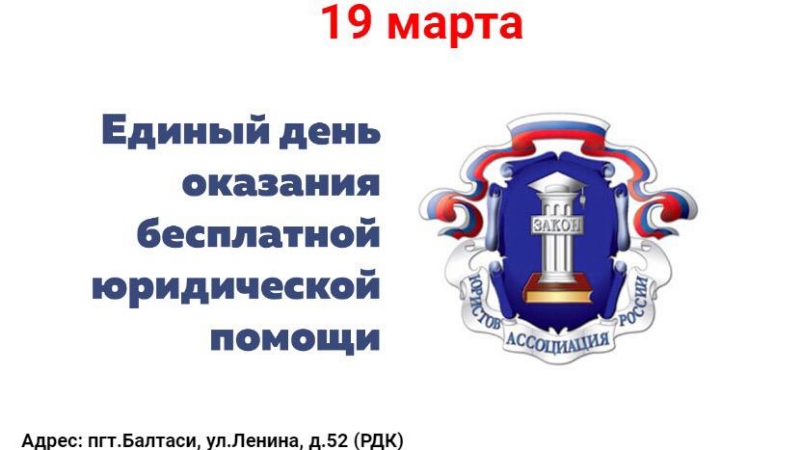 Уважаемые жители района! 19 марта 2019 года состоится День бесплатной юридической помощи населению, по адресу: пгт.Балтаси, ул.Ленина, д.52 (РДК).