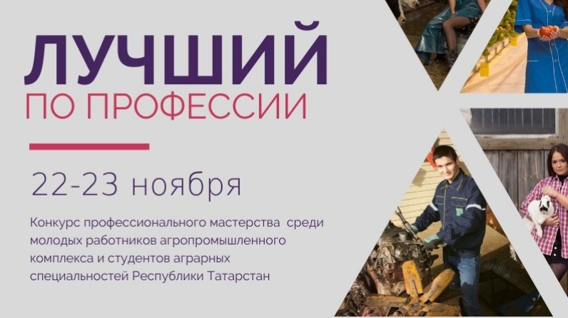 С 22 по 23 ноября в рамках реализации подпрограммы «Сельская молодежь Республики Татарстан на 2014-2020 годы» пройдет конкурс профессионального мастерства «Лучший по профессии» среди молодых работников агропромышленного комплекса Республики Татарстан. Организаторами конкурса выступают региональная общественная организация «Аграрное молодежное объединение Республики Татарстан», Министерство сельского хозяйства и продовольствия Республики Татарстан и Министерство по делам молодёжи Республики Татарстан.