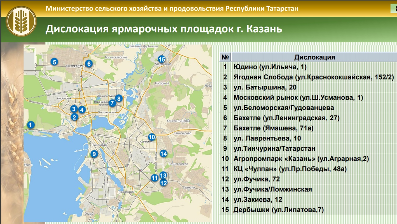 С адресами и месторасположением сельскохозяйственных ярмарок можно ознакомиться на официальном сайте Минсельхозпрода РТ.