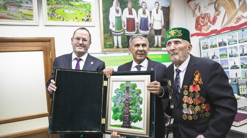 Также Рустам Нургалиевич посетил краеведческий музей «Дружба народов» в селе Ципья и встретился с директором музея - участником Великой Отечественной войны Гарифзяном Галиевичем Галиевым. Президент высоко оценил экспозицию музея и вручил в подарок музыкальный инструмент - гусли.