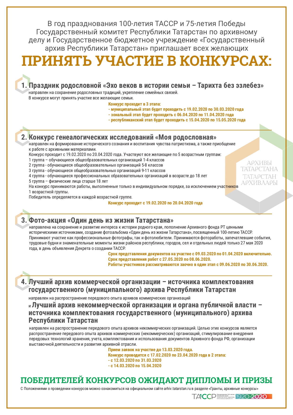 В год празднования 100-летия ТАССР и 75-летия Победы Государственный комитет Республики Татарстан по архивному делу и Государственное бюджетное учреждение «Государственный архив Республики Татарстан» приглашает всех желающих принять участие в конкурсах: