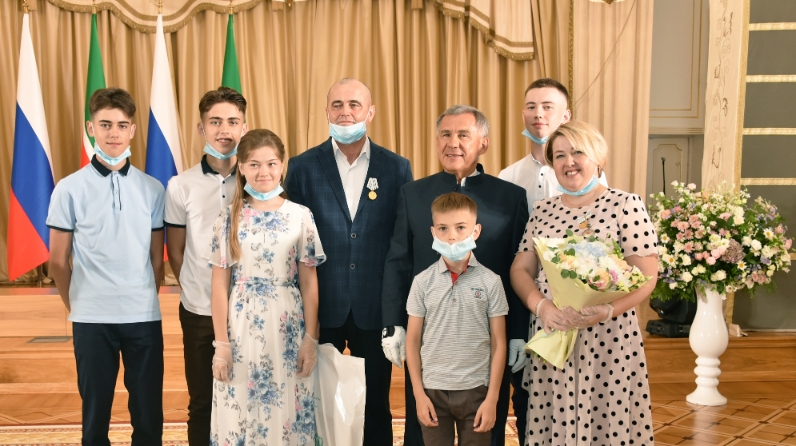 Затем состоялась церемония вручения государственных наград. За заслуги в укреплении института семьи и воспитании детей медаль ордена «Родительская слава» получили супруги Булат и Фирая Зиятдиновы из Балтасинского района – родители пятерых детей.