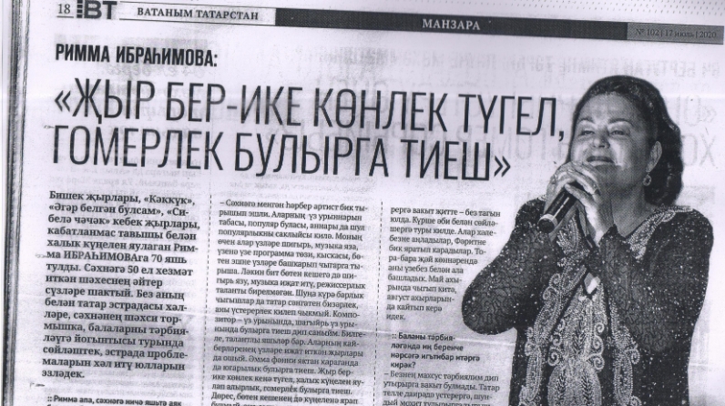 Заслуженной артистке ТАССР, народной артистке РТ, нашему земляку - Римме Ибрагимовой исполнилось 70 лет. В связи с этим в газете опубликована беседа с Риммой Мубараковной, 50 лет проработавшей на сцене.