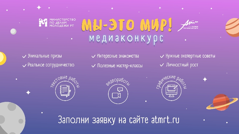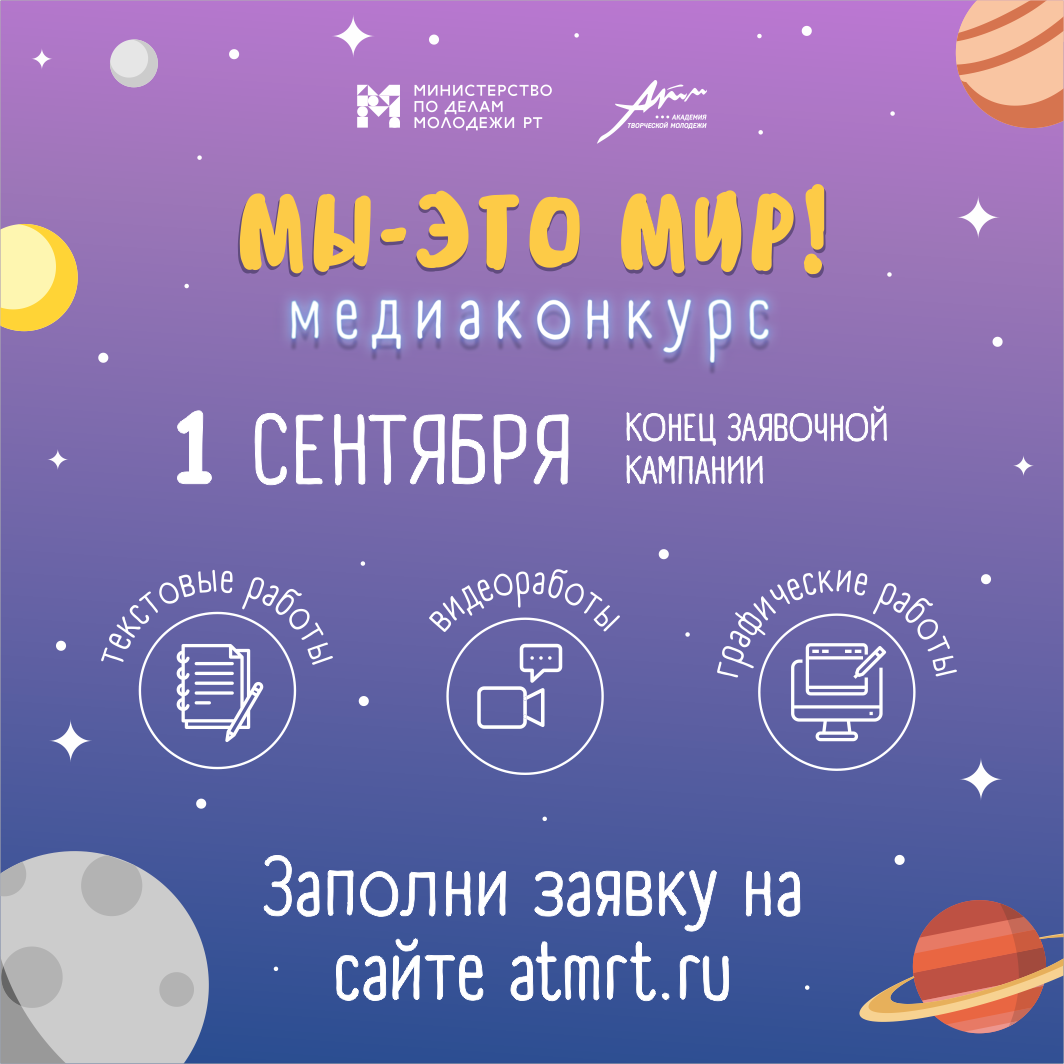 1 июня 2020 года стартовал прием заявок на новый сезон проекта РОО «Академия творческой молодежи Республики Татарстан» и Министерства по делам молодежи Республики Татарстан – Медиаконкурса «Мы – это мир!».