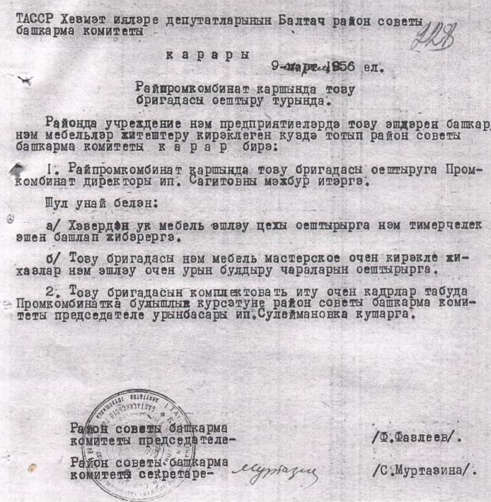 Выписка из протокола заседания исполнительного комитета Балтасинского районного Совета депутатов трудящихся от 9.04.1956