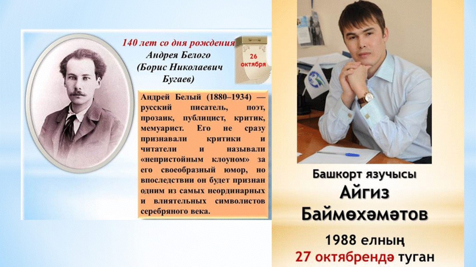 26 октября исполнилось 140 лет со дня рождения Андрея Белого - поэта, прозаика, философа, одной из культовых фигур серебряного века. 27 октября день рождение башкирского писателя Айгиза Баймухаметова, который обрел своих читателей через автобиографическую повесть "Калдырма, әнкәй!"