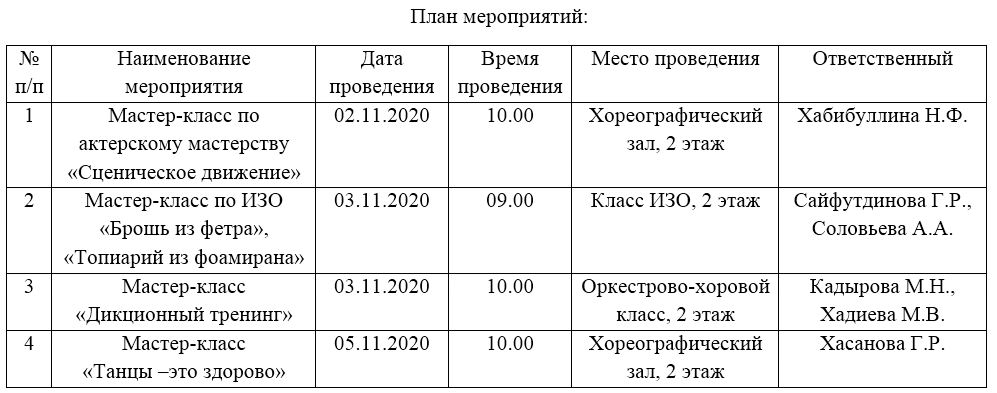 По устному поручению Президента Республики Татарстан Р.Н. Минниханова с целью организованного и содержательного досуга детей в осенний каникулярный период 2020 года в рамках проекта «Нескучные каникулы» в МБУ ДО «Детская школа искусств» проводятся мастер-классы. Все мероприятия Балтасинского муниципального образования будут размещены на официальных аккаунтах под хештегом #нескучныеканикулы2020.