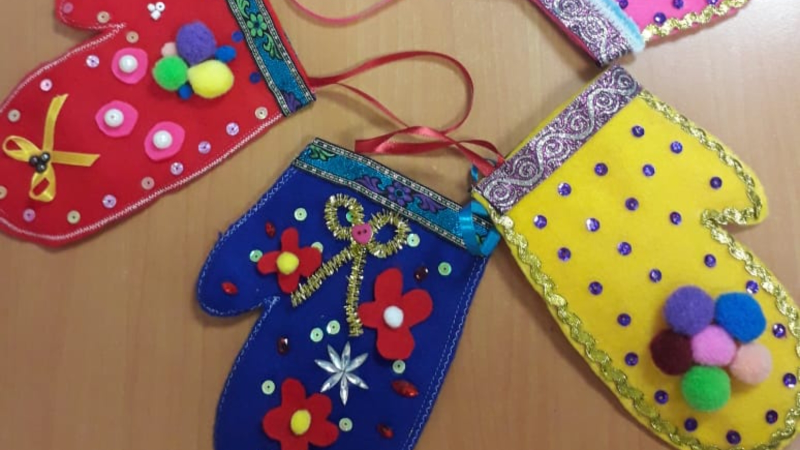 В первую часть мероприятия мамы совместно с детьми украсили фетровые «варежки Деда Мороза». Пока мамы были заняты украшением, незадействованные маленькие гости играли со специалистами отделения социальной помощи семье и детям в различные игры на развитие мелкой моторики.