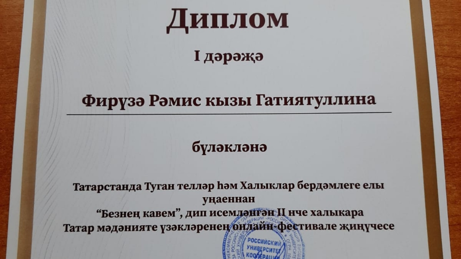 Читатели Балтасинской центральной взрослой библиотеки приняли активное участие во II Международном онлайн фестивале татарских культурных центров "Безнең кавем", посвященном Году родных языков и народного единства в Татарстане. Гатиятуллина Фирюза награждена дипломом 1 степени, Кабирова Алсу дипломом 3 степени. Поздравляем! Пусть и дальше будет много радостных успехов!