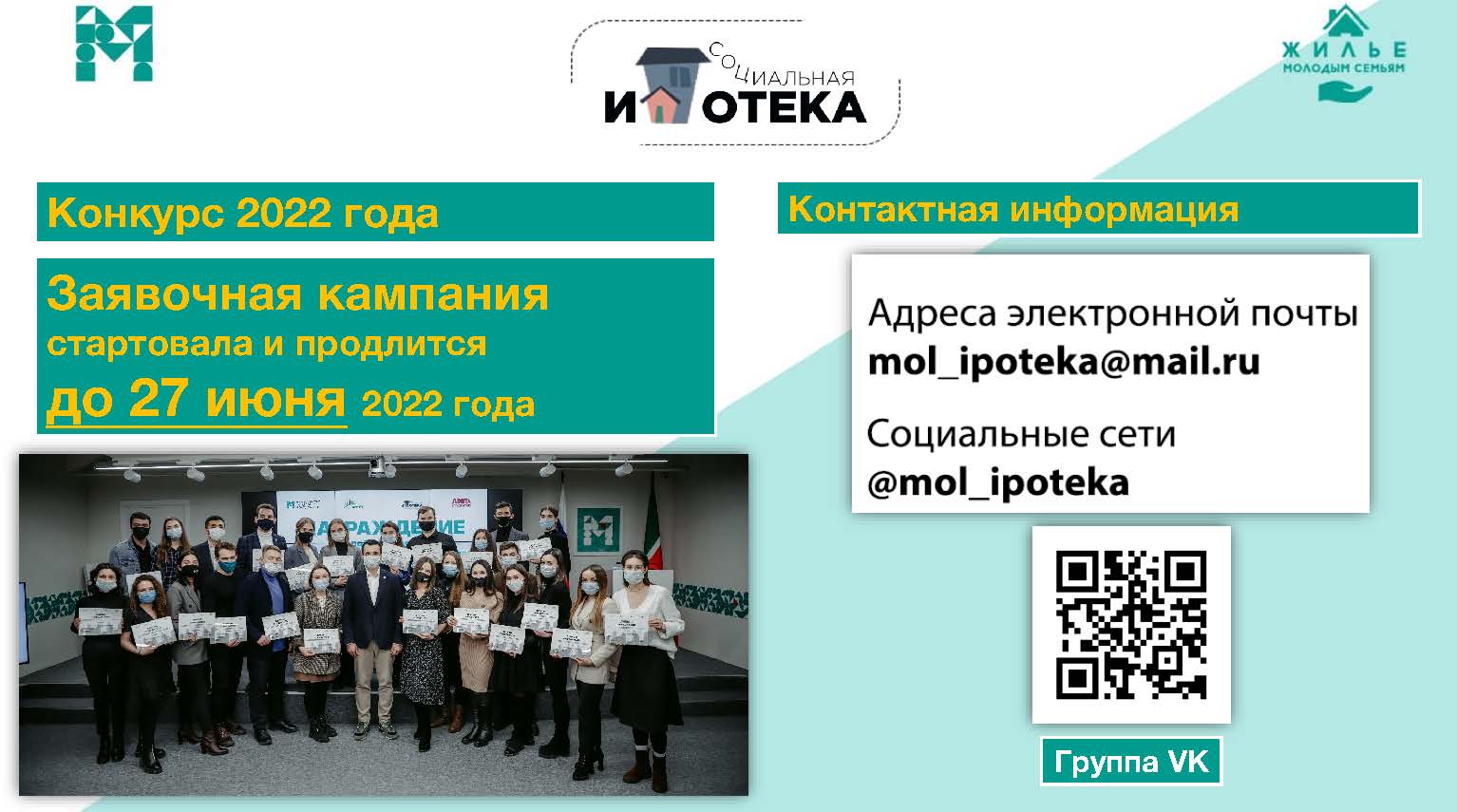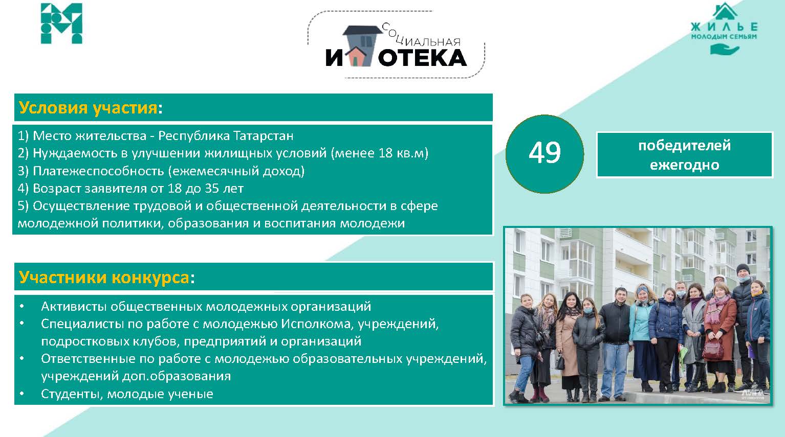 В целях государственной поддержки в улучшении жилищных условий молодежи, молодых специалистов по работе с молодежью в 2022 году проводится «Молодежный жилищный конкурс» на получение жилья по программе социальной ипотеки. Организатором Конкурса выступает Региональная молодежная общественная организация «Лига студентов Республики Татарстан».
