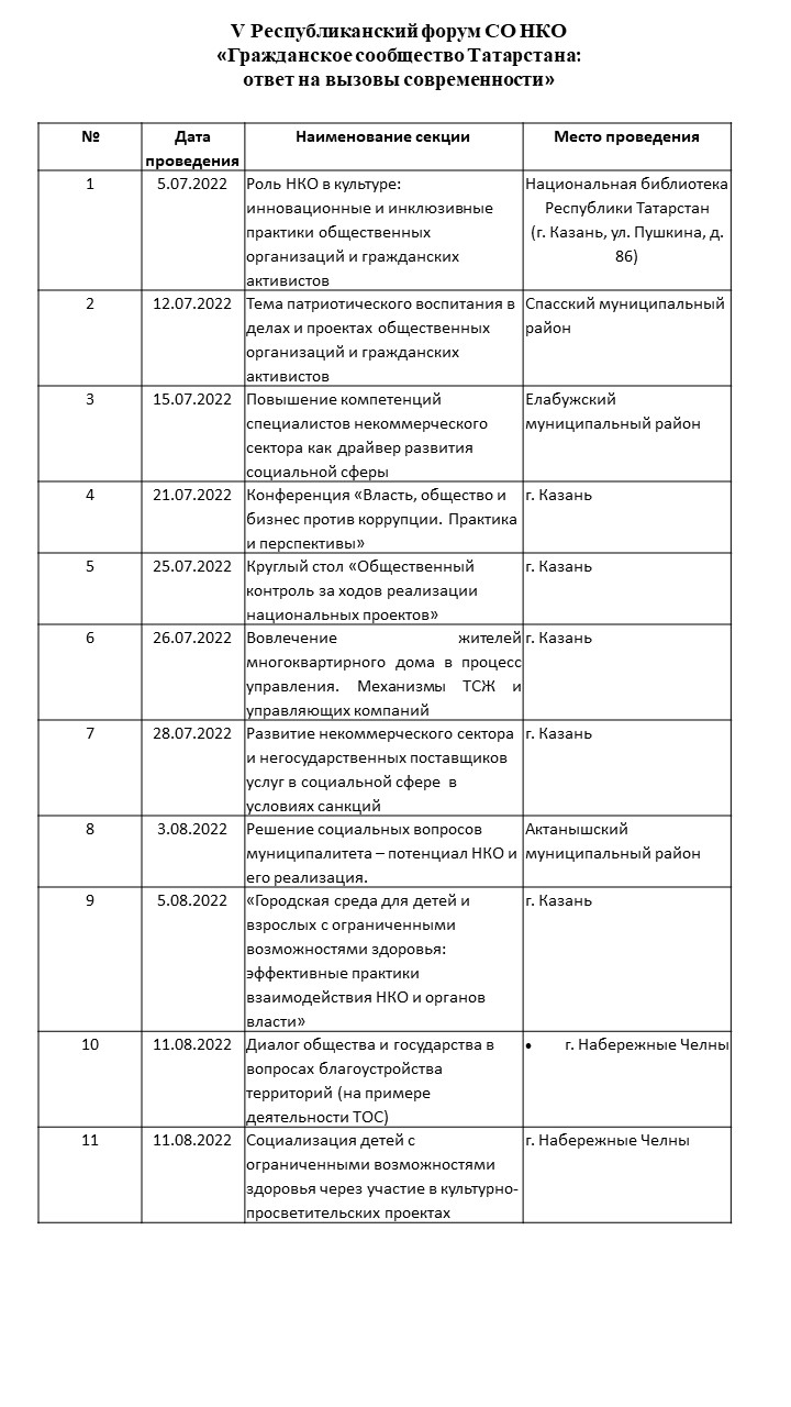 Общественная палата Республики Татарстан во исполнение Комплексного плана действий Правительства Республики Татарстан по реализации Послания Президента Республики Татарстан Государственному Совету Республики Татарстан в июле-августе 2022 года организует Республиканский форум социально ориентированных некоммерческих организаций. Пленарное заседание форума состоится 23 августа 2022 года в рамках форума «Сообщество» Приволжского федерального округа.