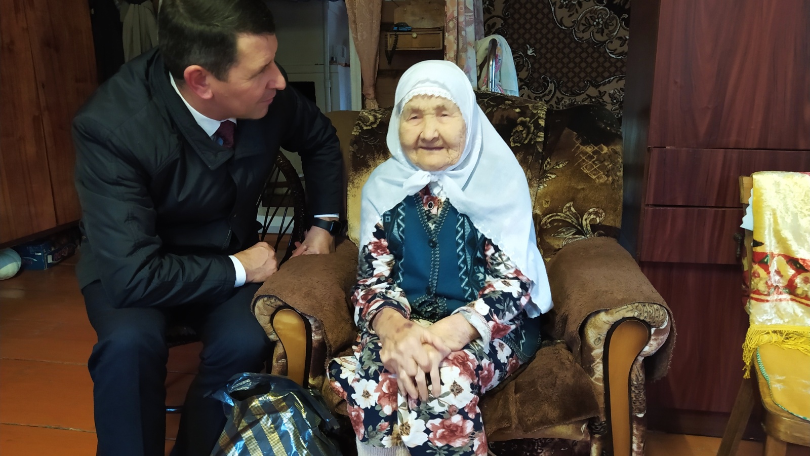 Поздравление долгожителей района - Нину Зарипову (99 лет) и Петра Карабаева ( 97 лет) - с Декадой пожилых людей. Удивляет не только возраст этих двух уважаемых людей, но и позитивное отношение к жизни.