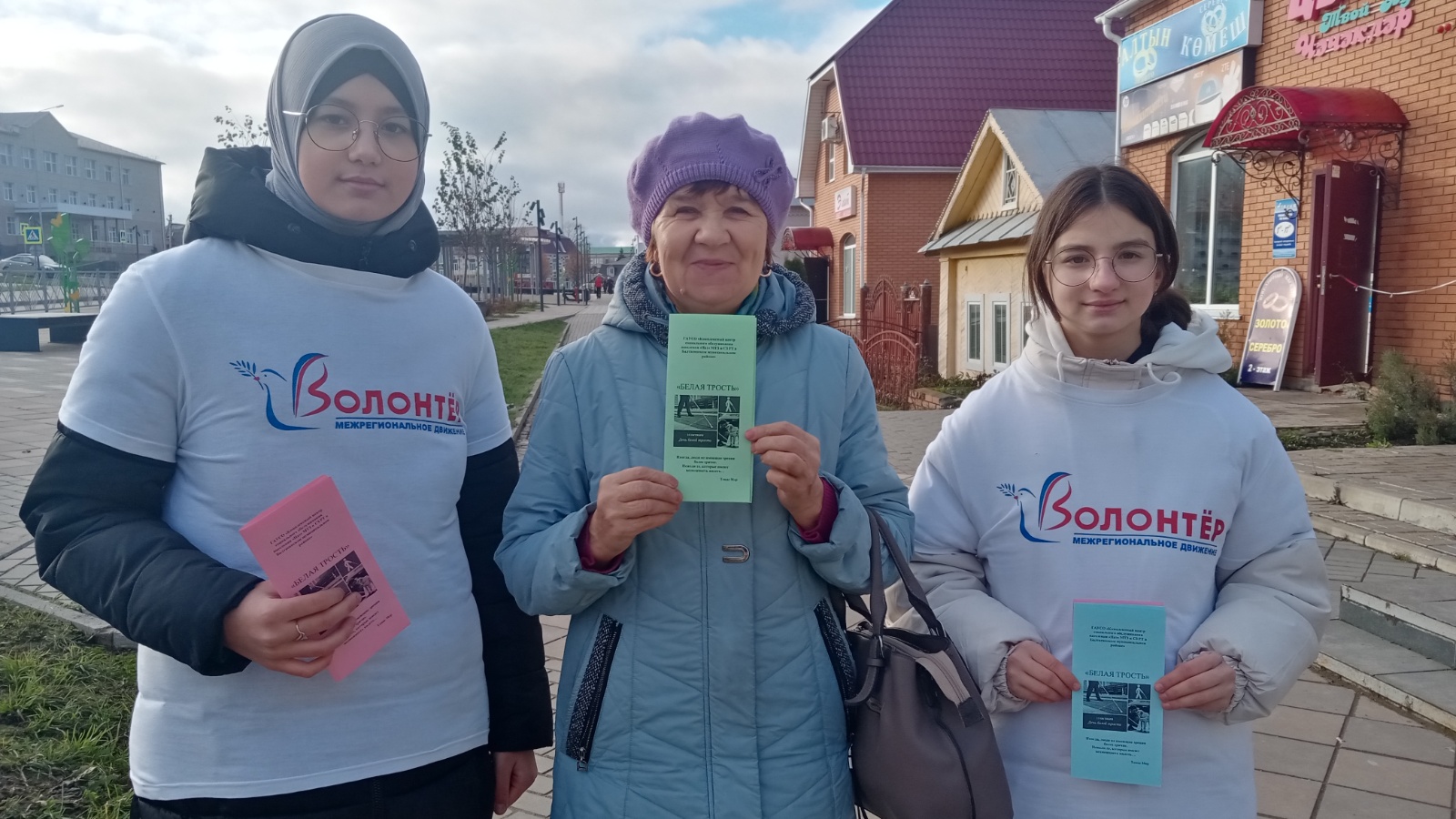В рамках проведения месячника «Белая трость» 1 ноября 2022 года активистами добровольческого центра «Волонтер» под руководством куратора, социального педагога отделения социальной помощи семье и детям Балтасинского КЦСОН «Наз» Натальи Сагитовой на улицах пгт Балтаси были розданы буклеты «Все мы разные…». Акция посвящена привитию толерантного отношения к незрячим людям. В буклетах раскрыта тема призыва граждан к созданию комфортных условий жизни в социуме для каждого человека, независимо от состояния здоровья, возраста и т.д.