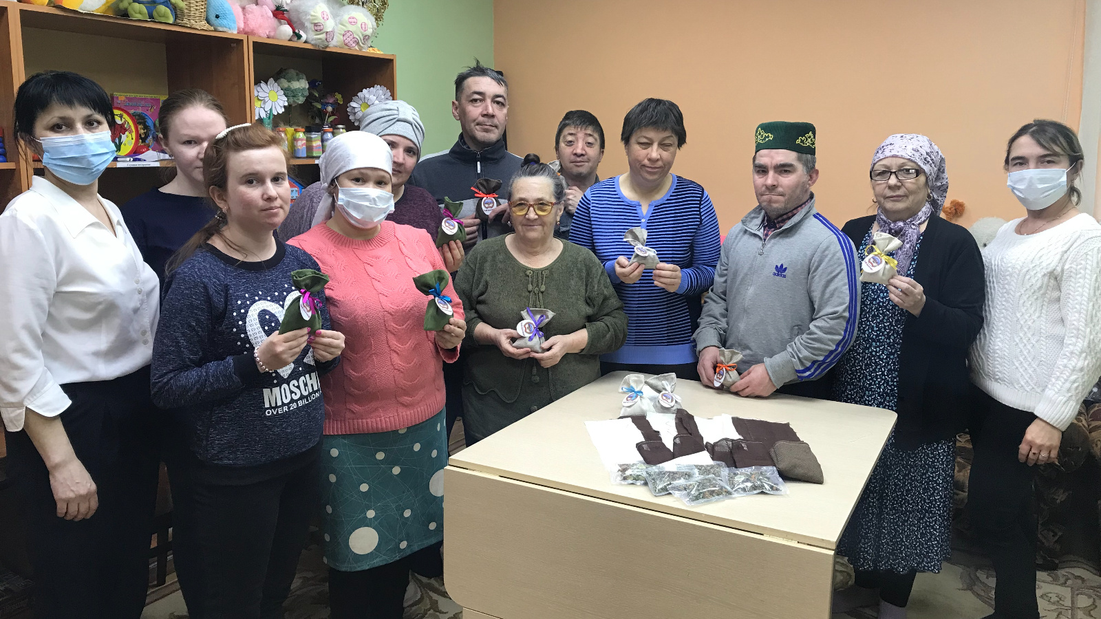 В рамках деятельности группы дневного пребывания совместно со специалистами отделения социальной помощи семье и детям комплексного центра социального обслуживания населения «Наз» в Балтасинском муниципальном районе были изготовлены креативные мешочки с чаем «Чай здоровья» для участников боевых действий в Афганистане. Участники группы очень ответственно подошли к поставленной задаче, приложили немало усилий. Участники были разделены на малые группы, одни изготавливали выкройки мешочков, другие шили мешочки в кабинете «Швейное дело», третья группа упаковывала чай в герметичные упаковки. В результате совместной деятельности и слаженной работы получилось 108 мешочков «Чая здоровья», которые были розданы 15 февраля в Парке Воинам Отечества участникам боевых действий и гостям митинга.