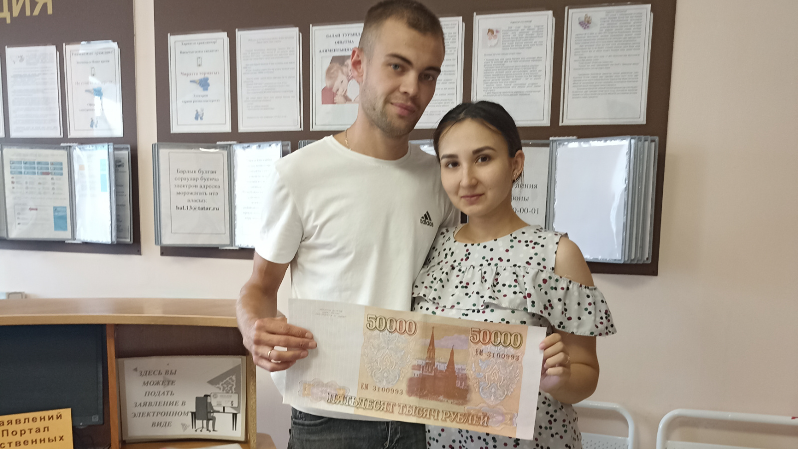В рамках реализации проекта молодая семья Хадиевых из деревни Шишинер получила меры социальной поддержки. Лилия и Рифнур родили первого ребенка до 25 лет и получат 50000 рублей.