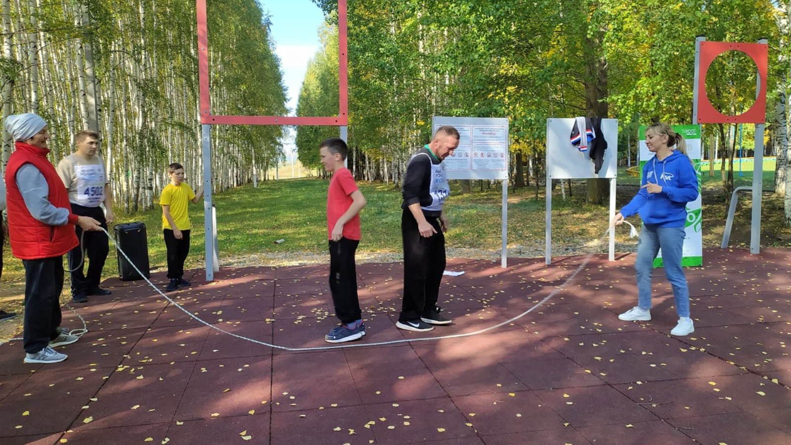 Каждой семье нужно было пройти 6 этапов на время: Турник, Баскетбол, Скакалка, Бег с эстафетной палочкой, Эстафета с обручами, Сбор мячей.