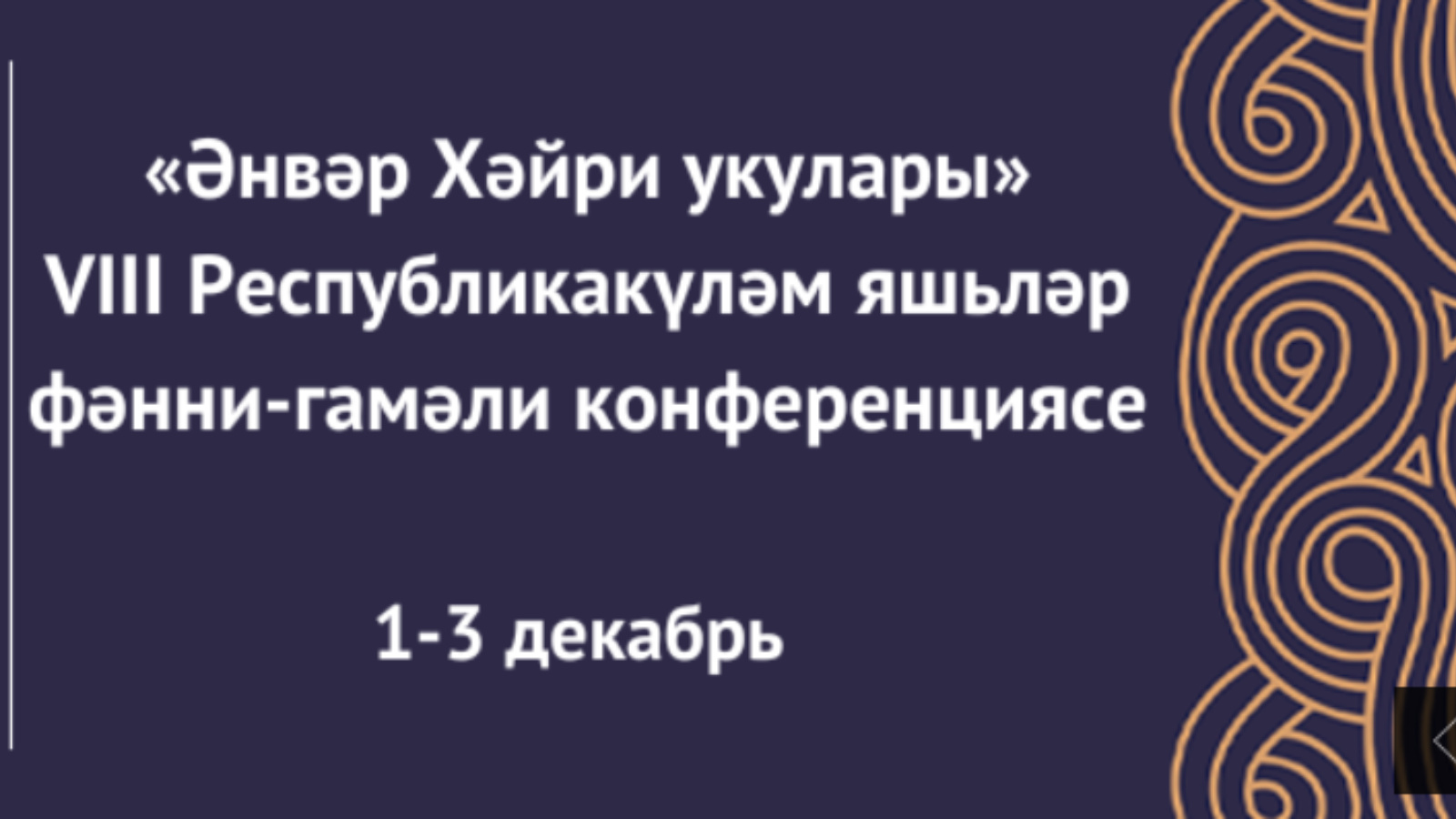 1–3 декабря в с.Билярске Алексеевского муниципального района Республики Татарстан Татарстанский республиканский молодежный общественный фонд «Сэлэт» совместно с Государственным бюджетным учреждением «Молодежный центр «Сэлэт» при поддержке Министерства по делам молодежи Республики Татарстан, Министерства образования и науки Республики Татарстан, Казанского федерального университета, администрации Алексеевского муниципального района проводят Республиканскую молодежную научно-практическую конференцию «Чтения Анвара Хайри» («Әнвәр Хәйри укулары») (далее – Конференция).