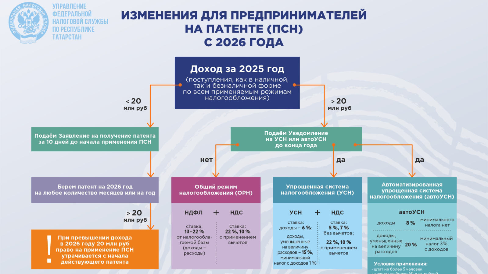 Предпринимателям, чьи поступления в 2025 году превысят порог в 20 млн, необходимо до 1 января выбрать иную систему налогообложения  — например, упрощённую (УСН) или автоматизированную УСН. В случае, если налогоплательщик не подаст заявление на УСН или автоУСН, то он  автоматически будет считаться плательщиком общего режима налогообложения. Те, кто соответствует новому лимиту и планирует работать на ПСН с 1 января 2026 года, должны подать заявление в налоговую не позднее, чем за 10 рабочих дней до начала применения патента. Сделать это можно через личный кабинет налогоплательщика, что также даст возможность скачать готовый документ, или иным удобным способом. Рассчитать предварительную стоимость патента поможет онлайн-калькулятор ФНС России.