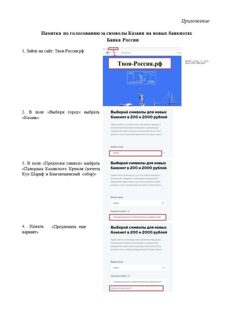 Учитывая изложенное, просим принять активное участие в голосовании за изображение символов города Казани на купюрах номиналом 200 и 2000 рублей («Панорама Казанского Кремля (мечеть Кул Шариф и Благовещенский собор)», «Казанский (Приволжский) федеральный университет (памятник Н.И.Лобачевскому)»).