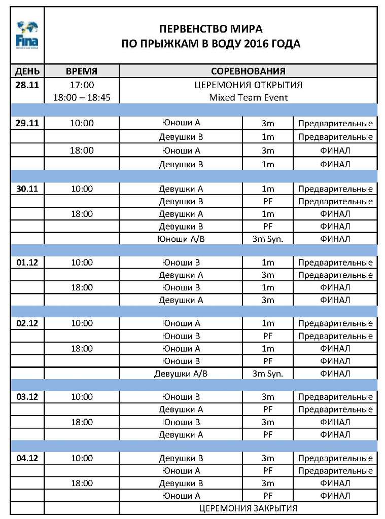 С 28 ноября по 4 декабря 2016 года на базе спортивного комплекса «Дворец водных видов спорта» (ул.Сибгата Хакима, д. 70) состоится первенство мира по прыжкам в воду. В данных соревнованиях запланировано участие около 450 юных спортсменов из 35 стран мира. Торжественная церемония открытия состоится 28 ноября в 17.00 часов.