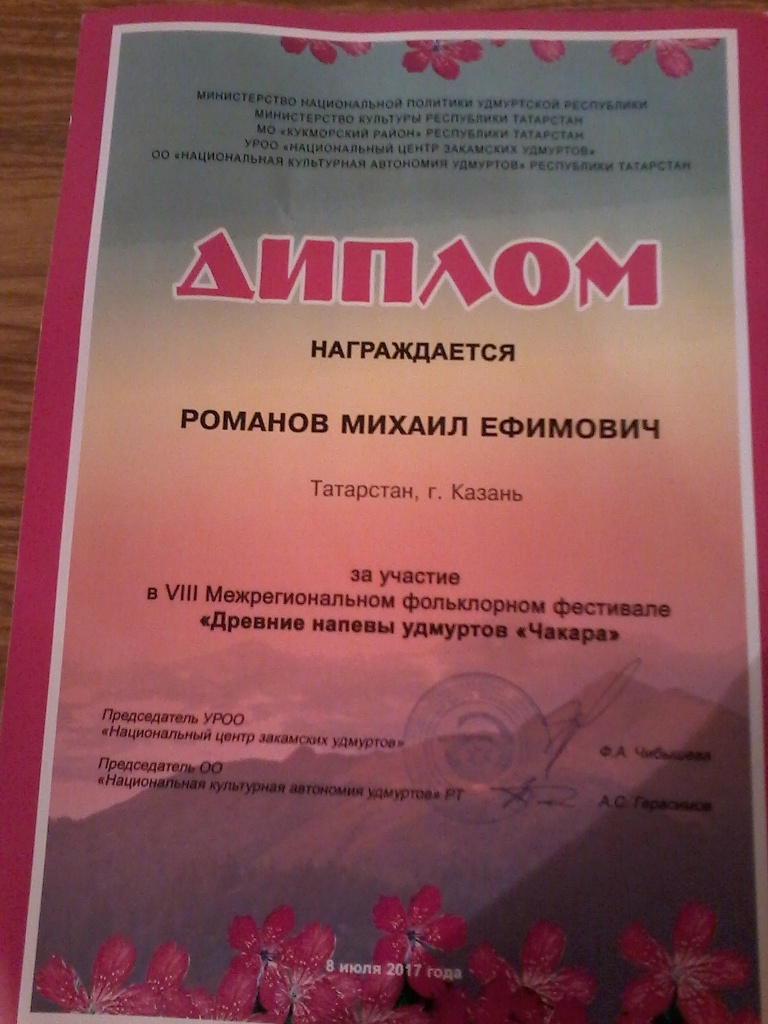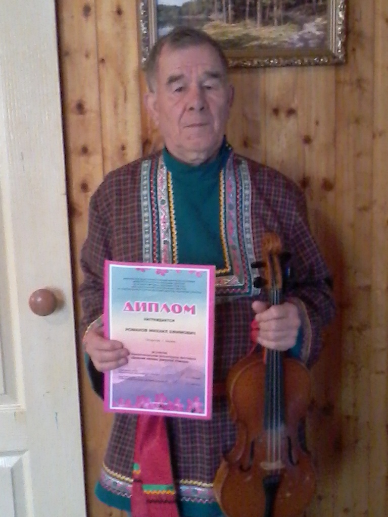 На праздник был приглашен и уроженец д.Нижняя Ушма Романов Михаил Ефимович, ныне проживающий в г.Казани, но частый гость в Малолызинском сельском поселении. Можно сказать, что это единственный народный скрипач не только в поселении, но и в Балтасинском районе. А ведь не так давно все праздники, свадьбы, проводы в армию отмечались с удмурстким кубызом. Это было роскошью. А теперь…. Романов Михаил помнит еще старые напевы удмуртов, сам сочиняет стихи и частушки, поет.