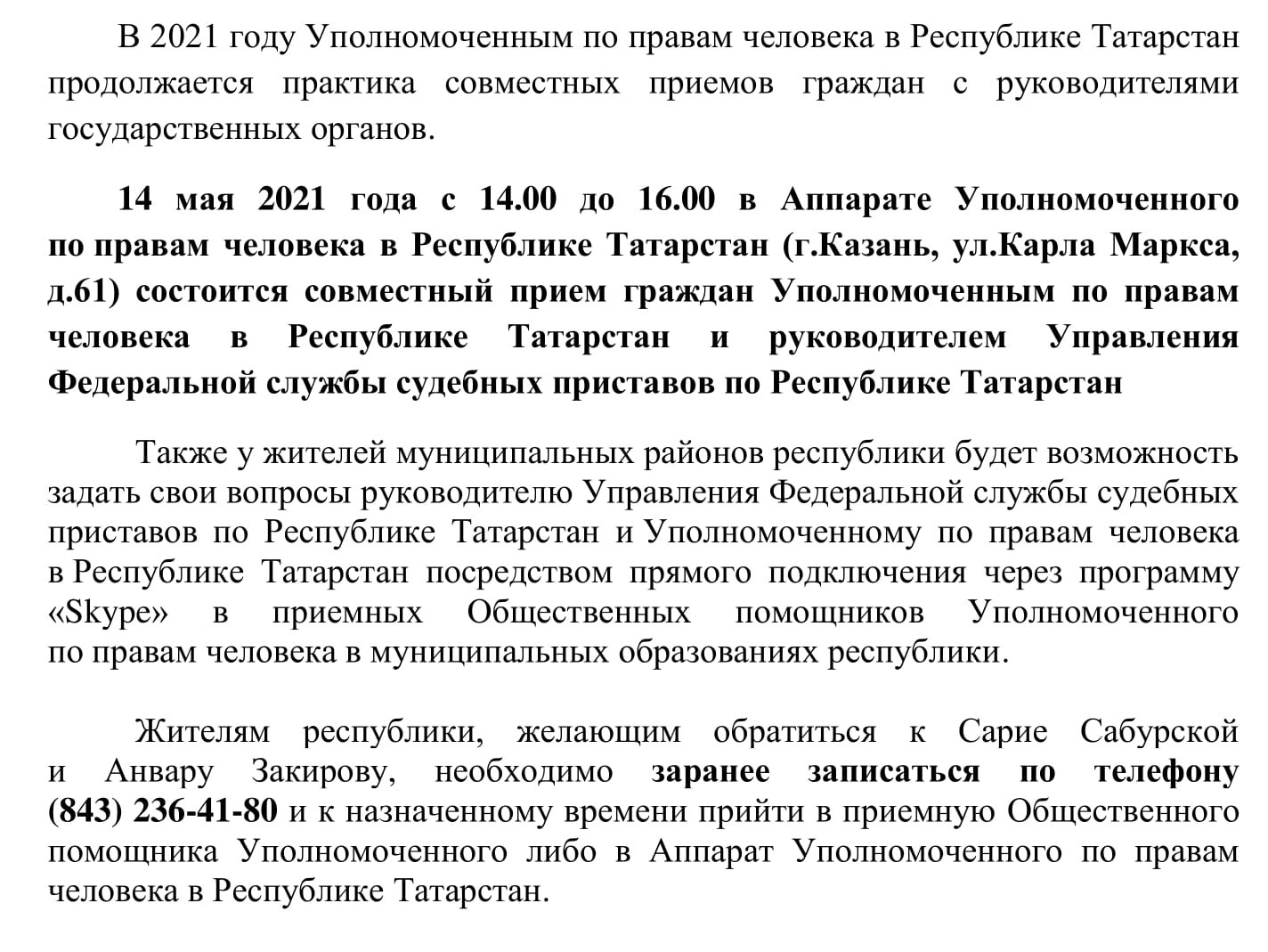 Совместный прием граждан Уполномоченным по правам человека в Республике Татарстан и руководителем Управления Федеральной службы судебных приставов по Республике Татарстан