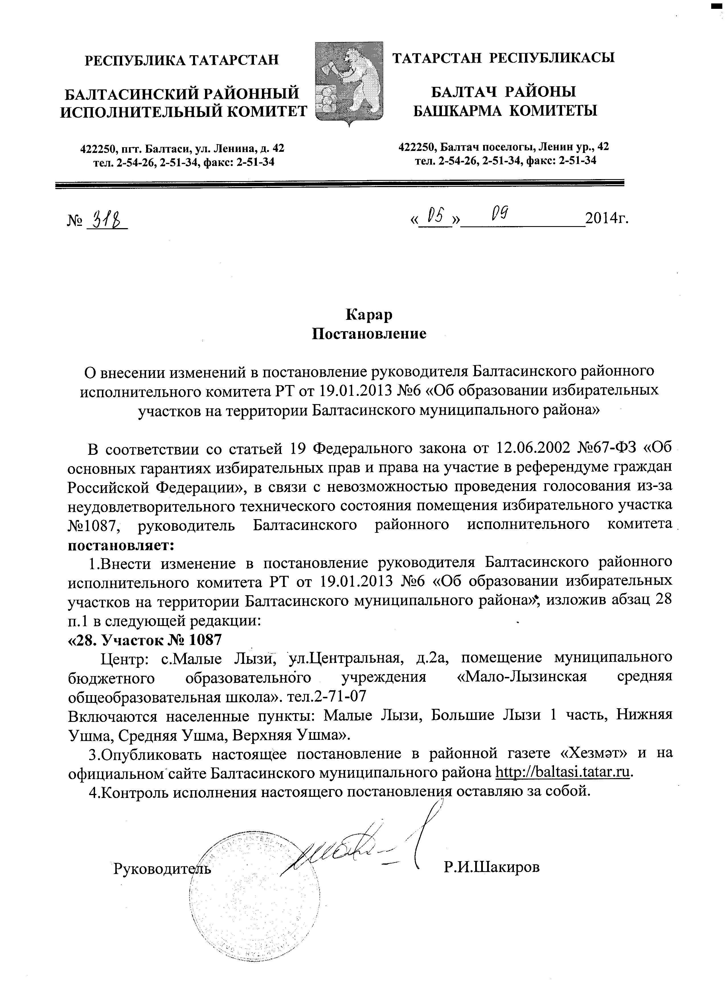 Постановление руководителя Балтасинского районного исполнительного комитета от 05.09.2014 №318 "О внесении изменений в постановление руководителя Балтасинского районного исполнительного комитета РТ от 19.01.2013 №6 "Об образовании избирательных участков на территории Балтасинского муниципального района"
