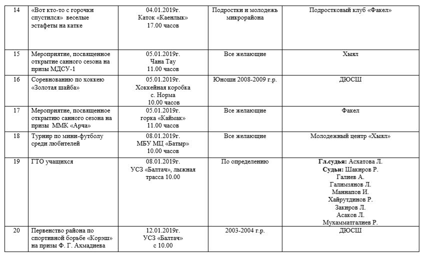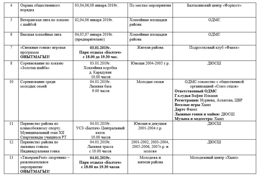 ТР Балтач районы башкарма комитеты яшьләр эшләре һәм спорт бүлегенең 2019 елның 1 гыйнварыннан 12 гыйнварына кадәр чаралар планы