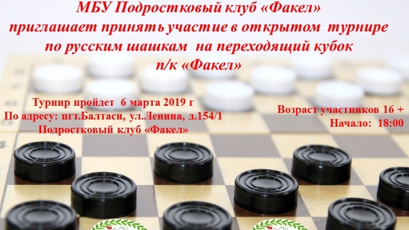 2019 елның 6 мартында 18: 00 сәгатьтә «Факел» яшүсмерләр клубында «Факел» я/к күчмә кубогына рус шашкалары буенча ачык турнир узачак.