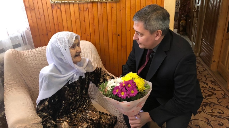 Юбилярга Россия Федерациясе Президенты Владимир Путинның котлау открыткасын, Балтач муниципаль район башлыгы исеменнән Рәхмәт хаты һәм кыйммәтле бүләк, авыл җирлеге исеменнәндә бүләк - күчтәнәчләр тапшырдылар.