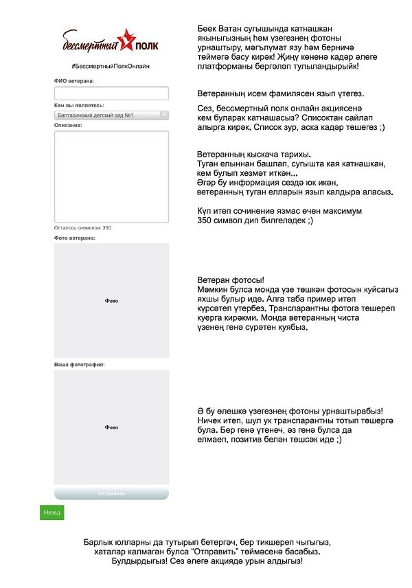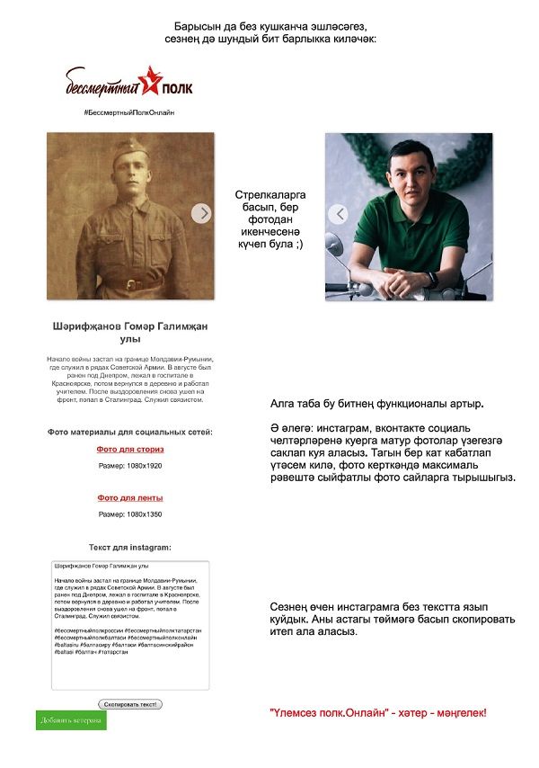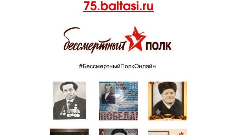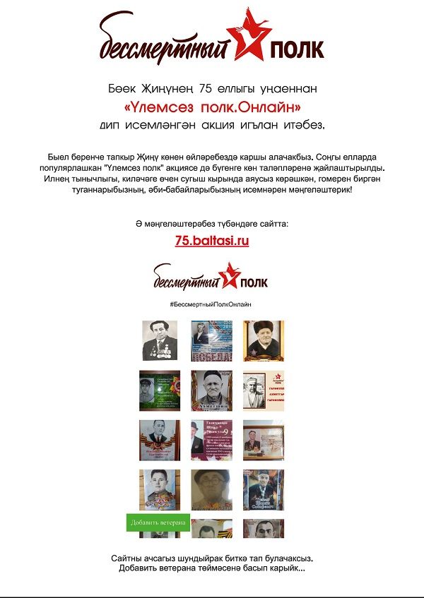 Хөрмәтле райондашлар! Илебез, республикабыз, районыбыз җирлегендә Бөек җиӊүнеӊ 75 еллыгын каршылау өчен зур әзерлек эшләре алып барылды. Әмма мәгълүм сәбәпләр аркасында тарихыбызда беренче тапкыр Бөек Җиӊүне үз көнендә парадлар, демонстрацияләр, митинглар белән уздыра алмаячакбыз. Соӊгы елларда бәйрәмнеӊ күрке булган «Үлемсез полк. Бессмертный полк» акциясе дә урамга чыга алмаячак. Әмма Җиӊү яулаган әби-бабайлар, әтиләр-әниләр, туганнар, абыйлар хәтер булып, бердәм булып, бер сафта, онлайн рәвештә парадка баса алачаклар. Районыбызда «Үлемсез полк. Онлайн» акциясе кысаларында 75.baltasi.ru сайты булдырылды. Бу сайтка кереп үзегезнеӊ сугышта катнашкан якыннарыгыз фотоларын урнаштыру сорала.
