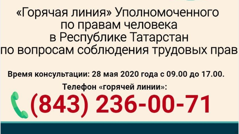 2020 елның 28 маенда Татарстан Республикасында Кеше хокуклары буенча вәкаләтле вәкил гражданнарга хокукый ярдәм күрсәтү һәм гражданнарның хокукларын саклауны тәэмин итү максатыннан республика гражданнарының хезмәт хокукларын яклау мәсьәләләре буенча «кайнар линия» үткәрә.