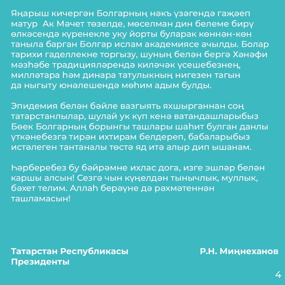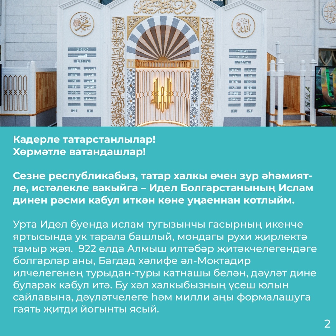 Идел Болгарстанының Ислам динен рәсми кабул иткән көне уңаеннан Татарстан Республикасы Президенты Рөстәм Миңнеханов мөрәҗәгате