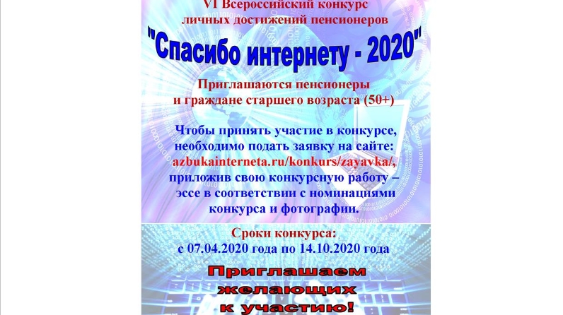 2020 елның 7 апрелендә компьютер грамоталылыгын өйрәнүдә пенсионерларның шәхси казанышлары буенча 6 нчы Бөтенроссия «Интернетка рәхмәт - 2020» конкурсы старт алды.