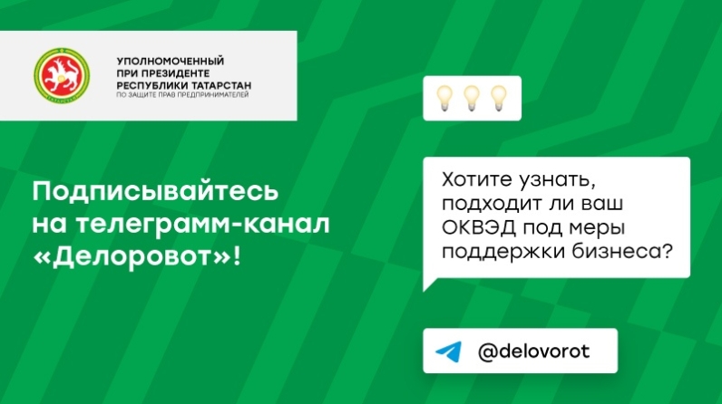 Telegram - «Деловорот» каналы (https://ttttt.me/delovorot) ТР бизнес-омбудсменының Татарстан эшмәкәрләре белән аралашуының турыдан-туры каналы булып тора. «Деловорот» каналы язылучылары ярдәм итүнең яңа дәүләт программалары һәм аларны ничек куллану турында беренчеләрдән булып беләчәкләр, эшмәкәрлек эшчәнлегенә кагылышлы законнардагы соңгы үзгәрешләр турында хәбәрдар булачаклар. Тelegram - «Деловорот» каналына язылыгыз, кушылыгыз!