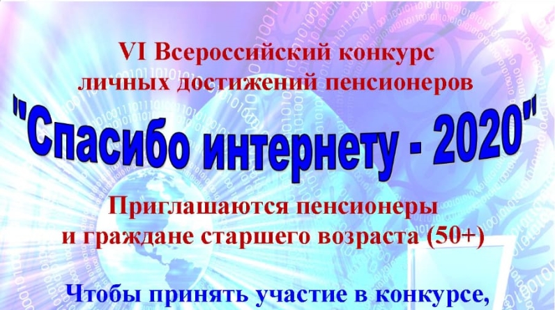 Пенсионерларны һәм өлкән яшьтәге гражданнарны (50+) «Интернетка рәхмәт-2020» VI Бөтенроссия пенсионерларының шәхси казанышлары конкурсында катнашырга чакырабыз.