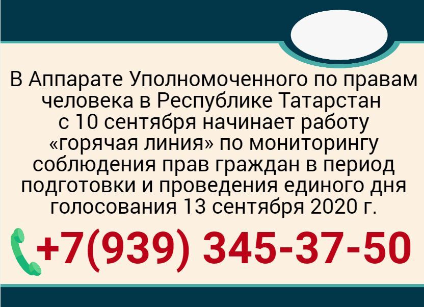 Татарстан Республикасында Кеше хокуклары буенча вәкаләтле вәкил Аппаратында 2020 елның 10 сентябреннән бердәм тавыш бирү көненә әзерлек һәм аны уздыру чорында гражданнарның хокукларын үтәүне мониторинглау буенча «кайнар линия» эшли башлый.