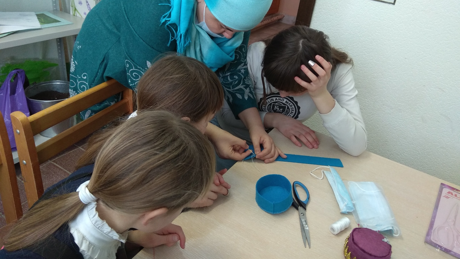 "Тегү эше" кабинетындагы чираттагы шөгыль практик эш форматында узды. Шөгыль башында социаль хезмәтләр алучылар тегү машиналары турында, аларны сатып алганда ничек дөрес сайларга кирәклеге турында сөйләштеләр. Чакырылган тегү остасы Әлфия Шәфигуллина тегү серләре белән уртаклашты. Тегүче остазлары астында күп балалы гаилә кызлары "Түбәтәй" татар милли баш киемен ясау эшен башлап җибәрделәр. Башта нигезен, аннары өске катламын да ясарга өйрәндек. Түбәтәйләрне бизәүне катнашучылар киләсе очрашу вакытында дәвам итәчәкләр.