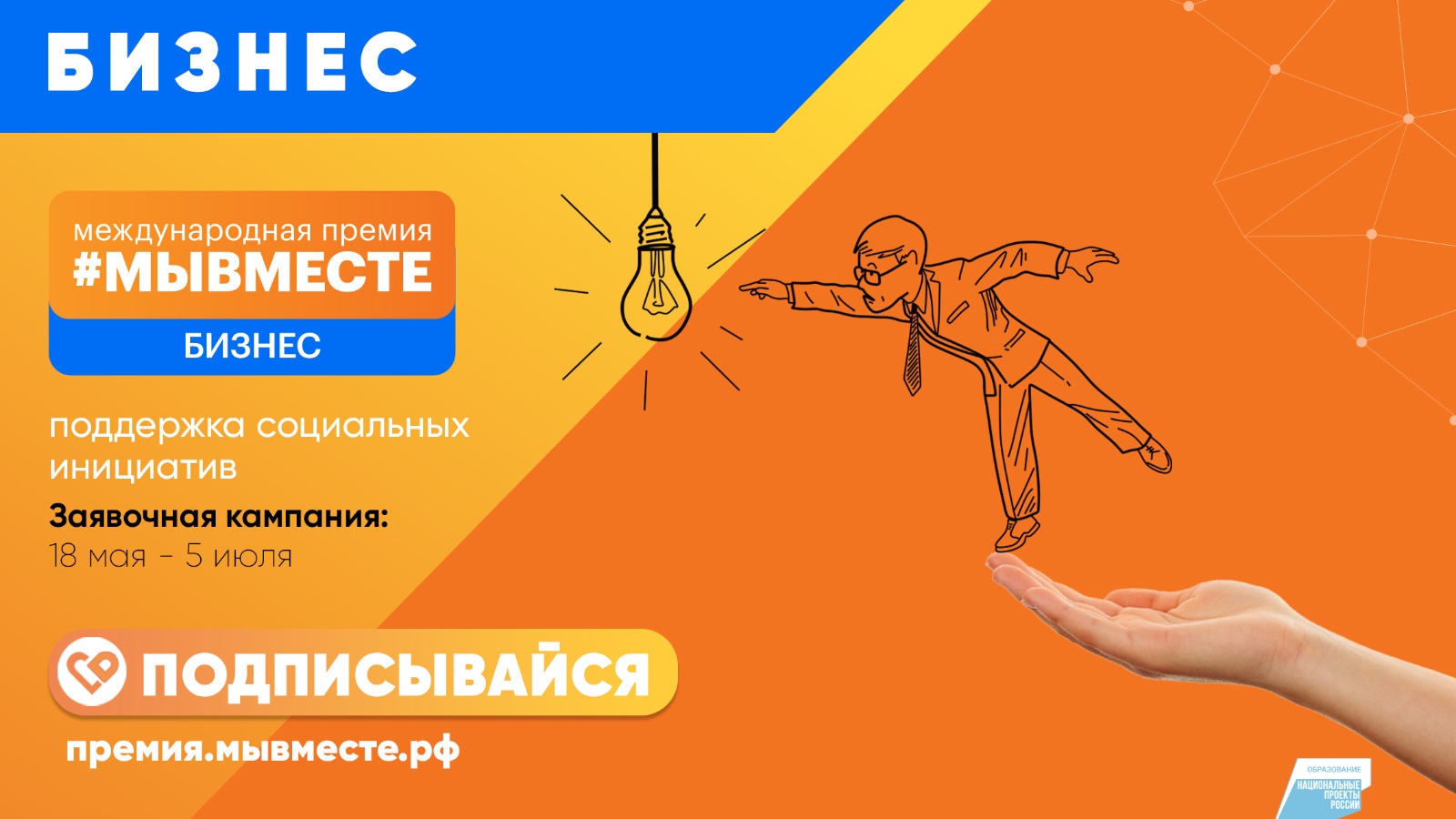 18 майда #МЫВМЕСТЕ Халыкара Премиясе старт алды, аның максаты - кешеләргә ярдәмгә һәм тормыш сыйфатын яхшыртуга юнәлтелгән социаль инициативаларга булышлык итү. Премия Россиянең милли максатларына ирешүгә багышланган һәм 4 тректан тора: «Волонтерлар һәм НКО», «Бизнес», «Медиа», «We are together».