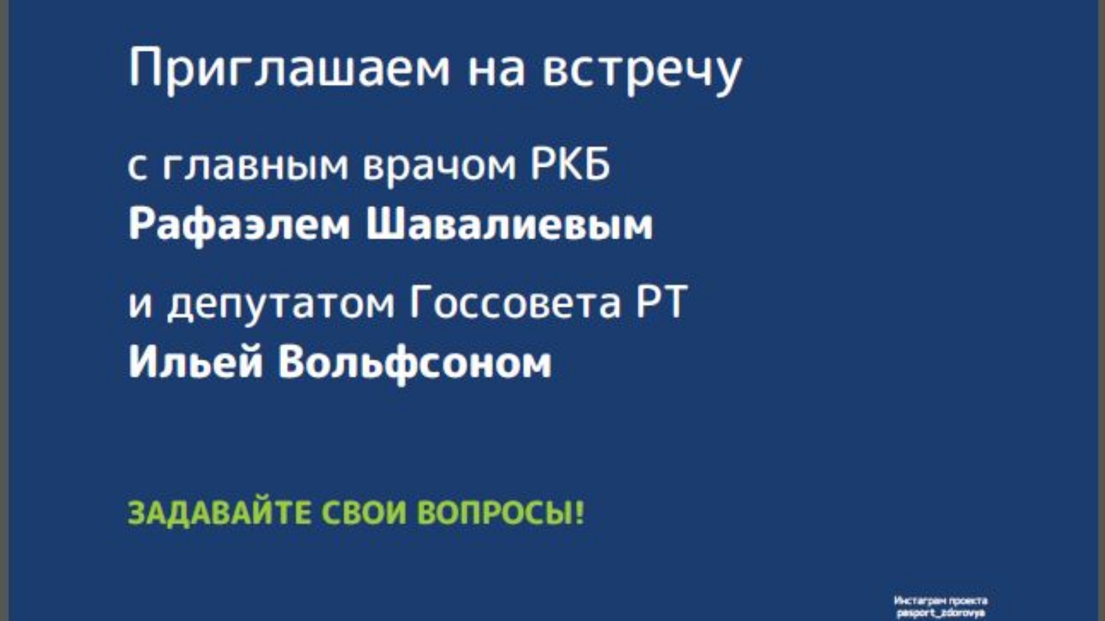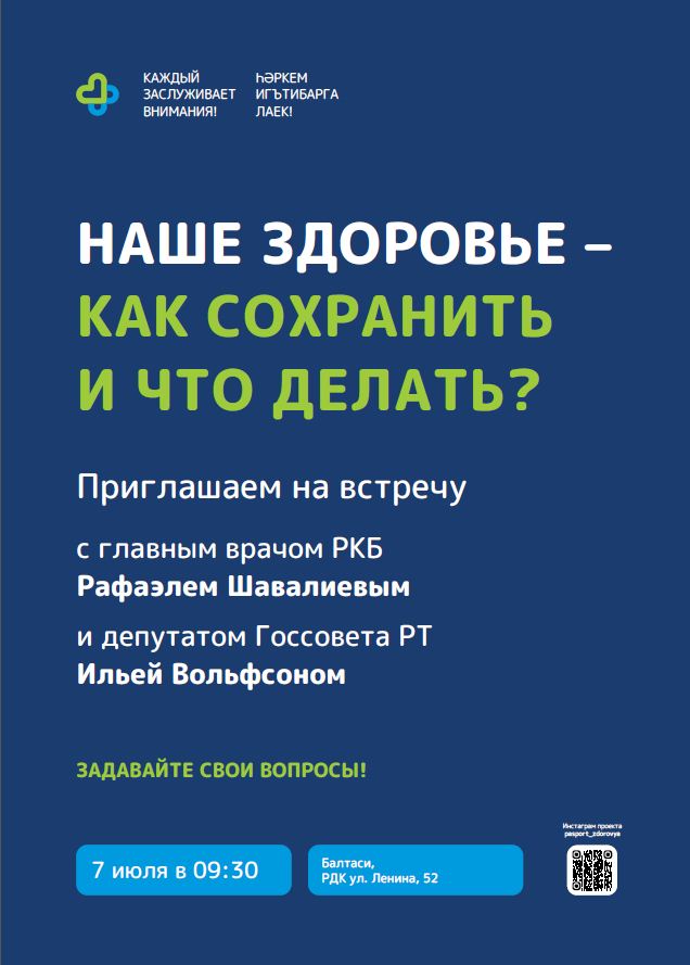 Чәршәмбе, 7 июль көнне, РКБның баш табибы Рафаэль Шәвәлиев @rafaelshavaliev һәм Татарстан Республикасының Дәүләт Советы депутаты Илья Вольфсон @i.volfson район мәдәният йортында халык белән очрашу уздырачаклар. Сәламәтлеккә кагылышлы һәм башка сорауларга җавап бирәчәкләр.