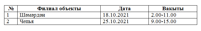 РТРС генераль дирекциясе тарафыннан расланган 2021 елга планлы ремонт эшләре графигы нигезендә , филиал объектларында аналог ("ТНВ" ТРК АҖ) һәм цифрлы телевидение һәм радиотапшырулар программаларын тапшыруны өзеп тору белән, планлы ремонт-профилактик эшләр үткәреләчәк: