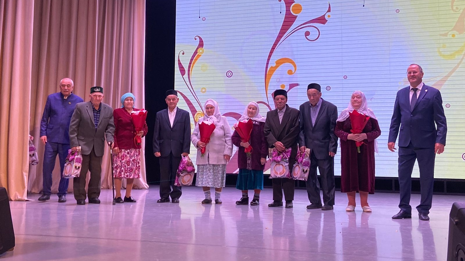 Сәхнә түренә шулай ук бәйрәмнең күркәм кунаклары, агымдагы елда үзләренең бриллиант, зөбәрҗәт, алтын туйларын билгеләп үтүче юбилярларыбыз да чакырылды.