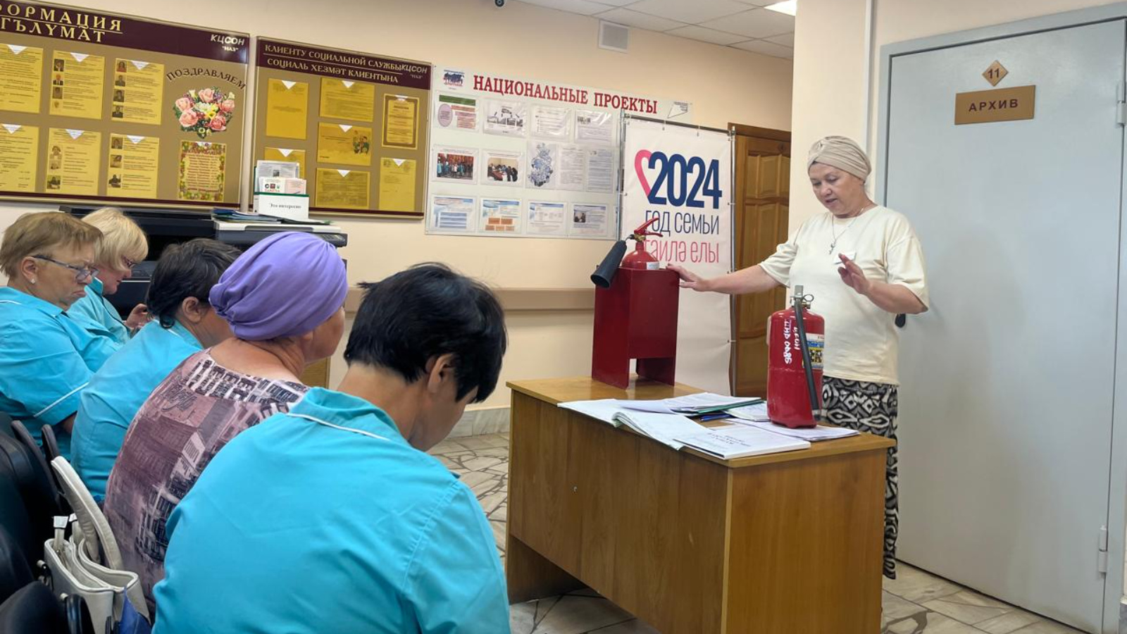 Директор урынбасары Лилия Гарипова социаль хезмәткәрләрне янгын куркынычсызлыгы кагыйдәләре белән таныштырды. Бу темага янгын сүндерүче белән эшләү буенча практик дәрес үткәрелде..